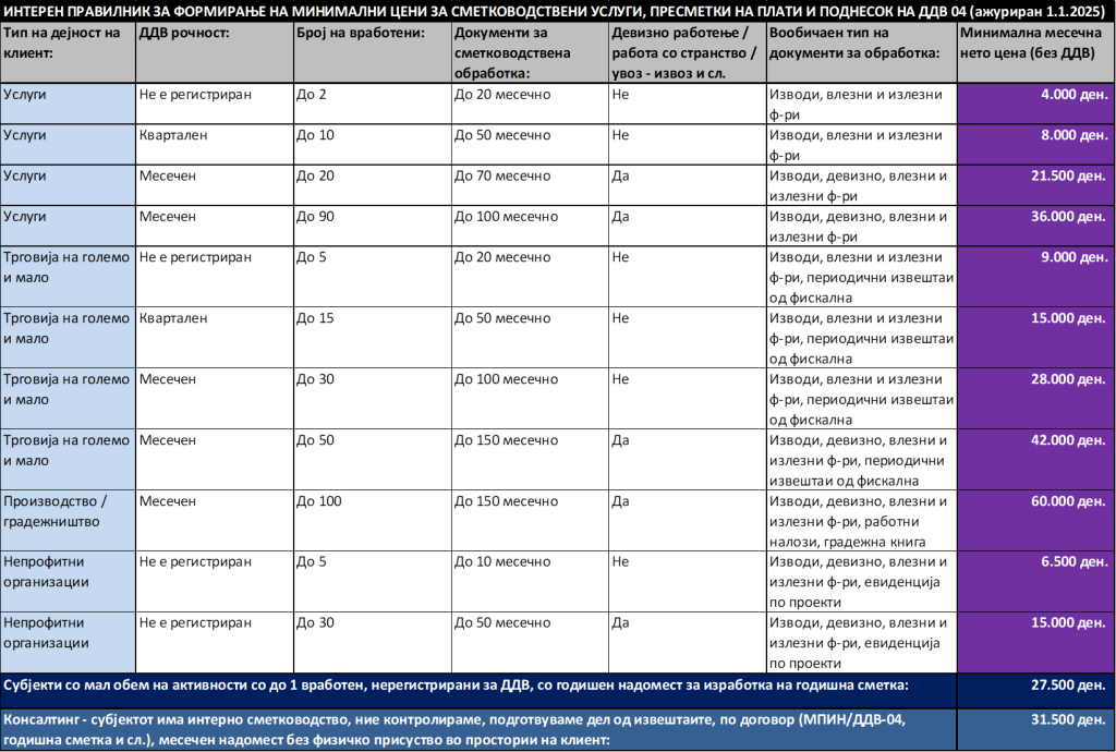 Цените се однесуваат на финансиско сметководство, евиденција на деловните настани врз основа на достапната документација, пресметки на плати и поднесок на ДДВ-04 пријава во соодветен рок.