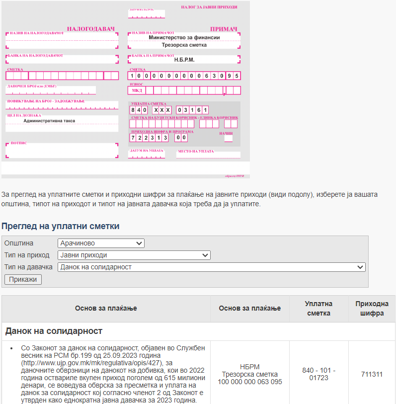 Почетна Известувања Објавени уплатните сметки за данок на солидарност Објавени уплатните сметки за данок на солидарност Од Blagoja Grozdanov - октомври 9, 2023 1089 Сметките може да ги најдете на Веб страната на УЈП. Линк до страната на УЈП…. Оваа содржина е само за претплатници.Актуелна понуда за консалтинг услуги Already a member? Log in here ПОВРЗАНИ СТАТИИПОВЕЌЕ ОД АВТОРОТ Објавен правилникот за глобален данок (дополнителен данок на добивка) со образец КДДД/П Продолжен рокот за примена на стапката од 5% ДДВ при првиот промет на станови: измени и дополнувања во ЗДДВ 15.1.2026: краен рок за уплата на 2% од вкупните приходи за работа во недела и државни празници во 2025 година согласно Законот за трговија