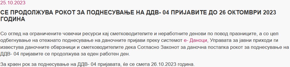Почетна Известувања Рокот за поднесок на ДДВ 04 продолжен за еден ден Рокот за поднесок на ДДВ 04 продолжен за еден ден Од Blagoja Grozdanov - октомври 26, 2023 888 Соопштението на УЈП ќе го најдете на следниот линк…. Оваа содржина е само за претплатници.Актуелна понуда за консалтинг услуги Already a member? Log in here ПОВРЗАНИ СТАТИИПОВЕЌЕ ОД АВТОРОТ Објавен правилникот за глобален данок (дополнителен данок на добивка) со образец КДДД/П Продолжен рокот за примена на стапката од 5% ДДВ при првиот промет на станови: измени и дополнувања во ЗДДВ 15.1.2026: краен рок за уплата на 2% од вкупните приходи за работа во недела и државни празници во 2025 година согласно Законот за трговија